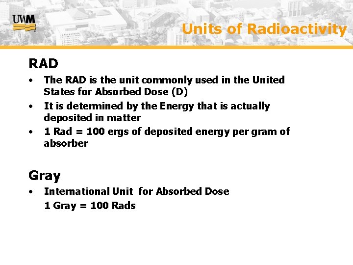 Units of Radioactivity RAD • • • The RAD is the unit commonly used in the United States for Absorbed Dose (D) It is determined by the Energy that is actually deposited in matter 1 Rad = 100 ergs of deposited energy per gram of absorber Gray • International Unit for Absorbed Dose 1 Gray = 100 Rads