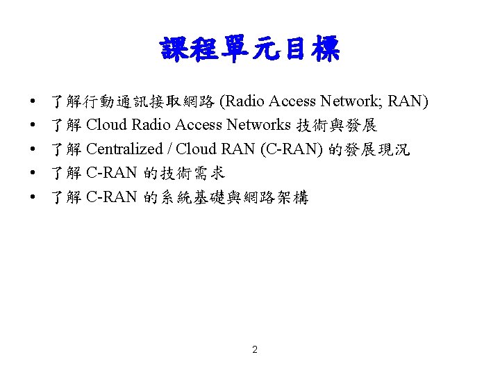 課程單元大綱 • • 無線接取網路 (Radio Access Network) Cloud Radio Access Networks Centralized / Cloud RAN (C-RAN) 的網路架構 建構 C-RAN 系統之技術 3