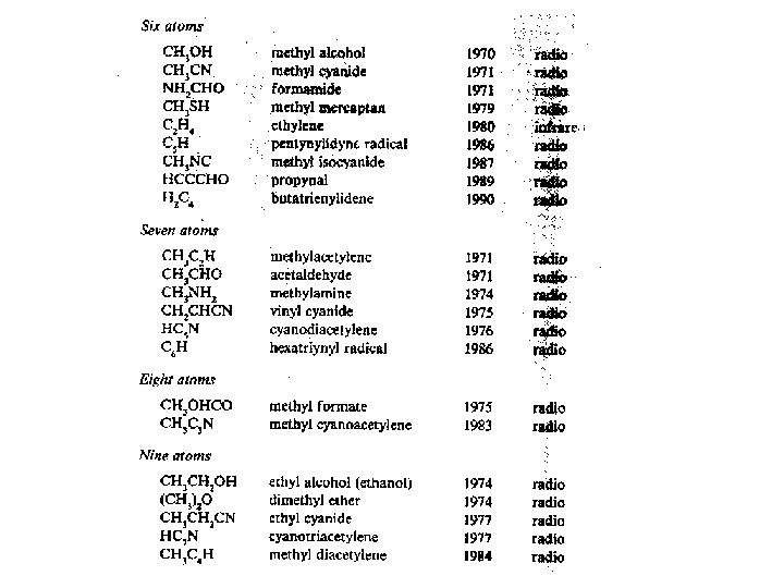 Interstellar Molecules • About 90% of the over 140 interstellar molecules discovered with radio telescopes. • Rotational (electric dipole) Transitions • Up to thirteen atoms • Many carbon-based (organic) • Many cannot exist in normal laboratories (e. g. , OH) • H 2 most common molecule: – No dipole moment so no radio transition. – Only observable in UV (rotational) or Infrared (vibrational) transitions. – Astronomers use CO as a tracer for H 2 • A few molecules (OH, H 2 O, …) maser 2/26/2021 33