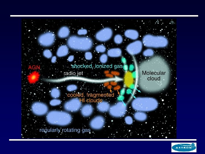 Apart from the radio the thin accretion disk around the AGN produces optical, UV, X-ray radiation The optical spectrum emitted by the gas depends upon the abundances of different elements, local ionization, density and temperature. § Photons with energy > 13. 6 e. V are absorbed by hydrogen atoms. In the process of recombining, line photons are emitted and this is the origin e. g. of Balmer-line spectra. § Collision between thermal electrons and ions excites the low-energy level of the ions, downward transition leads to the emission of so-called “forbidden-line” spectrum (possible in low density conditions).