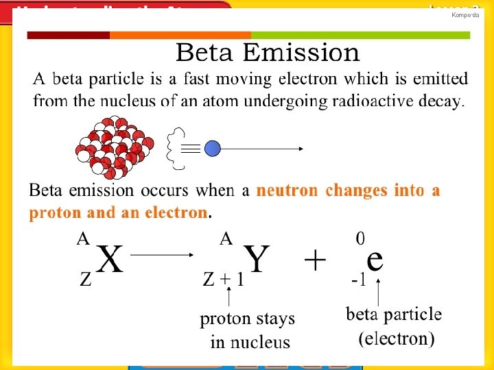 Radioactivity (cont. ) • Later discovery found the decay process occurs when an unstable atomic nucleus changes into a more stable nucleus by emitting radiation. • There are 3 different types of radiation – alpha particles, – beta particles, – gamma rays.