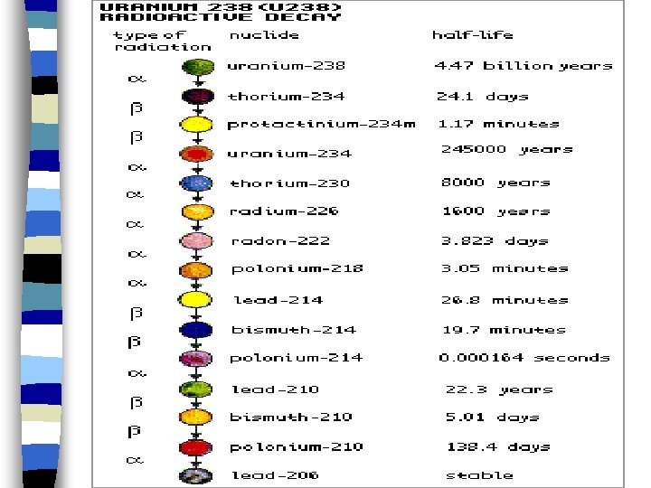 The Thorium Decay Series 220 4 216 --> 2 + 84 Po n 86 Rn 216 --> 4 + 212 Po Pb n 84 2 82 212 --> + 212 or Pb Bi n 82 - 83 212 --> 4 + 208 Bi Tl n 83 2 81 208 --> + 208 Tl Pb n 81 - 82 208 is stable n 82 Pb