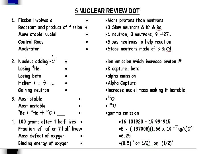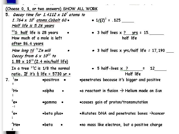 Pg 108 7. Show the equation for the fission of Th-232 with one fission product being Mo-96 plus the release of 2 neutrons 232 90 Th 96 Mo + 1 0 n If I had 20 g of U-235 & it decayed over 3 half-lives, how much would I have left?