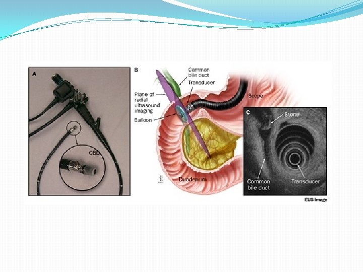 Technique: Une sonde miniaturisée d'échographie fixée à l'extrémité d'un endoscope souple, permettant d’explorer la tête du pancréas et les voies biliaires à travers la paroi duodénale. La proximité du transducteur permet l'utilisation de faisceaux ultrasonores de haute fréquence (7. 5 à 12 MHz), et donc une excellente résolution spatiale. La vésicule biliaire et l'infundibulum sont visualisés lors du passage dans le premier duodénum. La progression dans le deuxième duodénum permet l'exploration du cystique puis du cholédoque sur toute sa hauteur selon différents plans de coupes, la jonction biliopancréatique et l'ampoule de Vater.