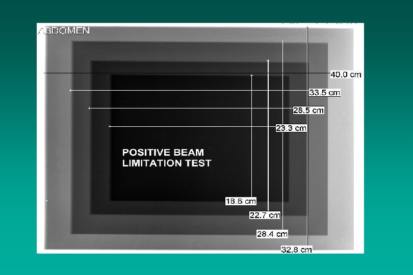 Positive Beam Limitation n n n No longer FDA-required Still available/common for non-digital systems Test for each cassette size Can often use single test cassette by overriding PBL or switching to manual mode Place angled cassette on table of in front of receptor to capture full field Limits: from CFR Common causes of Failure: – Mechanical failure of sensors – Calibrated for metric but english sizes used, etc
