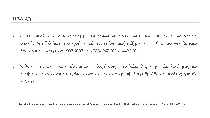 Δόσεις ακτινοβολίας προσωπικού στην Επεμβατική Ακτινολογία/Καρδιολογία Kim et al. Occupational radiation doses to operators performing cardiac catheterization procedures. Health Phys 2008 Mar; 94(3): 211 -2. Kim et al. Occupational radiation doses to operators performing fluoroscopically-guided procedures Health Phys 2012 Jul; 103(1): 80 -99
