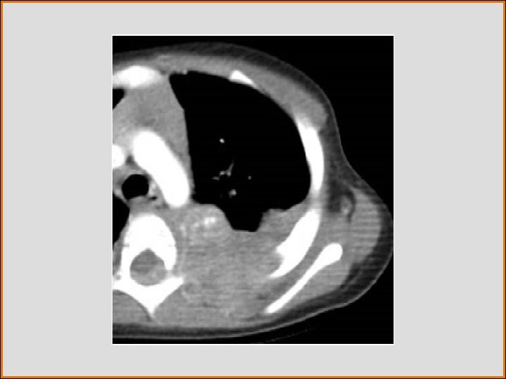 Discussion Bronchogenic Cyst • Are part of the family of foregut duplication cysts: bronchogenic, enteric, and neurenteric cysts • Result from abnormal ventral budding of the tracheobronchial tree between the 26 th and 40 th days of gestation • May occur in the mediastinum or in lung parenchyma, although mediastinal location is more common • Typically do not communicate with airway and do not contain air Radiograph showing a mass obliterating the posterior junction line. CT confirms posterior location and proved to be a bronchogenic cyst. -Whitten, et al Used with permission of the copyright owner