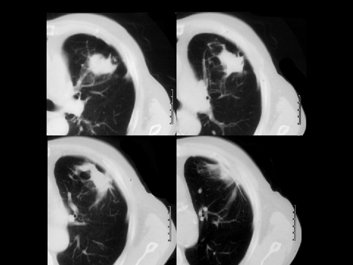 Findings and Differentials Findings: Frontal and lateral chest radiographs demonstrate a 3 -4 centimeter left upper lobe mass with surrounding areas of hyperlucency and arcuate parenchymal distortion. A healed left upper posterior rib fracture is noted. Four CT images show the irregular left upper lobe mass with peripheral attachment to thickened pleura. Note the parenchymal distortion in association with the inferomedial aspect of the lesion. Differentials: • Round atelectasis • Primary bronchogenic carcinoma