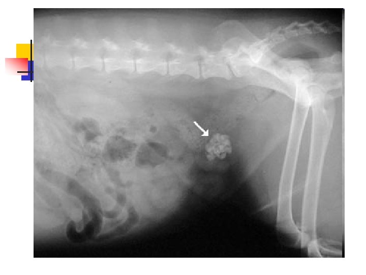 Bladder Stones n n Because most stones contain calcium, they are usually visible on a radiograph as white (bone density) objects in the area of the bladder. Sometimes there is a single large stone, and sometimes there are literally hundreds of tiny stones like sand or aquarium gravel.