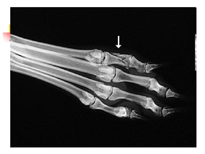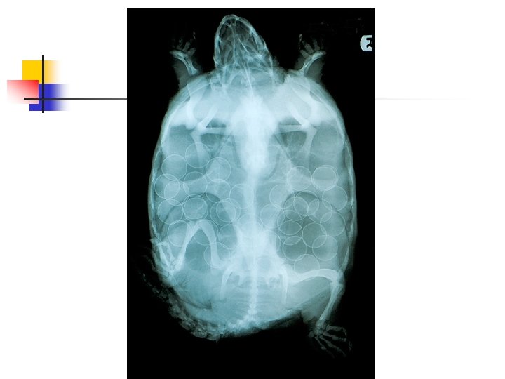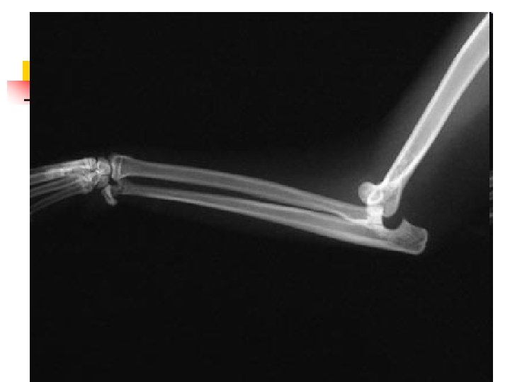 Interesting Radiographs n n X-rays are passed through the patient to expose a piece of radiographic film on the other side of the patient. Thin areas of the patient allow a lot of x-rays through, which exposes the film and turns it black. Thicker body parts absorb more x-rays, so less hit the film, resulting in white areas. Thus white objects are dense like bone, and black objects are thin like air.