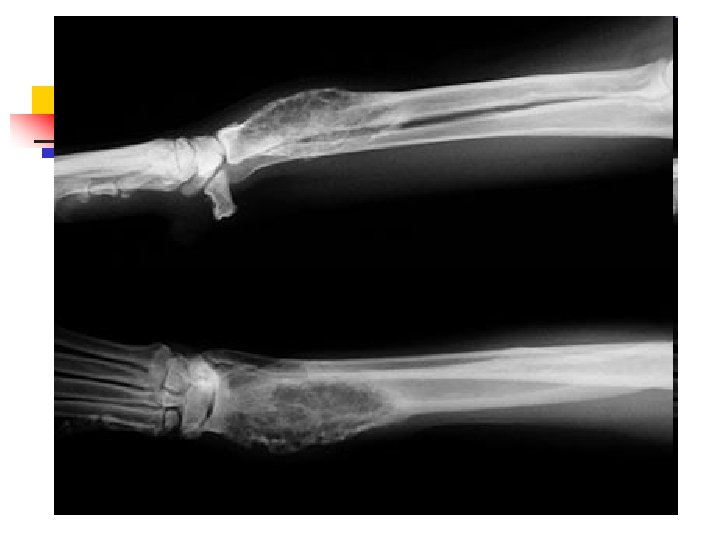 When Lameness isn’t Simple n n Sometimes when an animal limps the cause turns out to be something more serious than a simple injury. The doctors palpated a firm, painful lump in the leg this dog was favoring. Radiographs showed that the bone was expanded in that area, with a motheaten, hollowed-out center. These are classic signs of a tumor in the bone, known as an osteosarcoma.