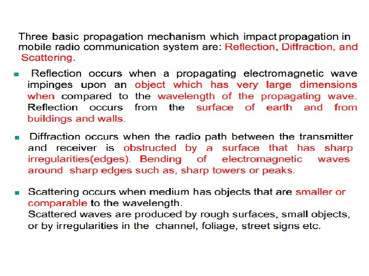 Propagation Mechanisms • Diffraction – Radio path between transmitter and receiver obstructed by surface with sharp irregular edges – Waves bend around the obstacle, even when LOS (line of sight) does not exist • Scattering – Objects smaller than the wavelength of the propagation wave - e. g. foliage, street signs, lamp posts