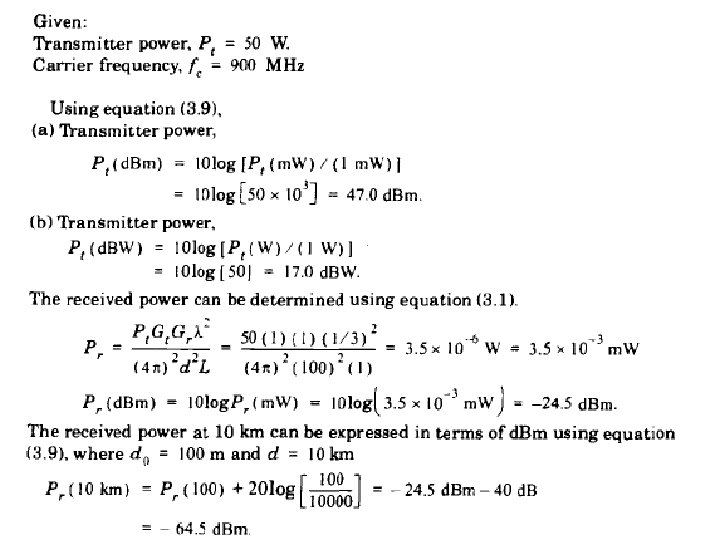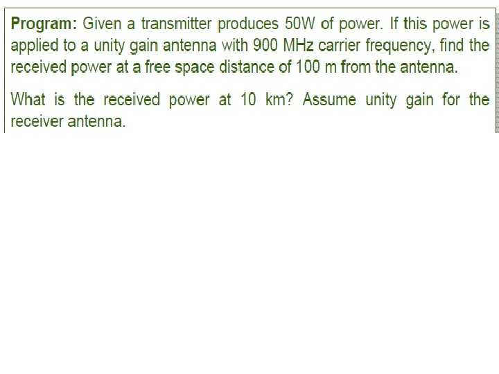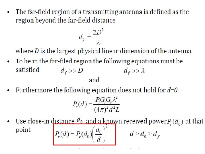 Free Space Propagation Model Free space Power received by a Receiver antenna separated from a radiating Transmitter antenna by a distance ‘d’ is given by Friis free space equation;