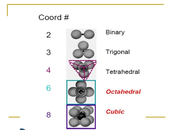 Radius Ratio Arrange of Anions around the cation Coordination Number (CN) 0. 15 - 0. 22 Corners of equilateral triangle Corners of a tetrahedron Corners of an octahedron corners of a cube 3 0. 22 - 0. 41 – 2. 42 0. 73 – 1. 37 1 Midpoints of cube edges 4 6 8 12