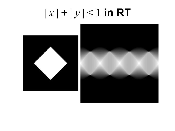 Radon transform properties • Image of any f + g is F + G • Image of cf is c. F for any real c • Rotation of f causes translation of F in α • Scaling of f in (x, y) causes scaling of F in s • Image of a point (2 D Dirac function) is sine wave line • Image of n points is a set of n sine wave lines • Image of a line is a point (2 D Dirac function) • Image of polygon contour is a point set