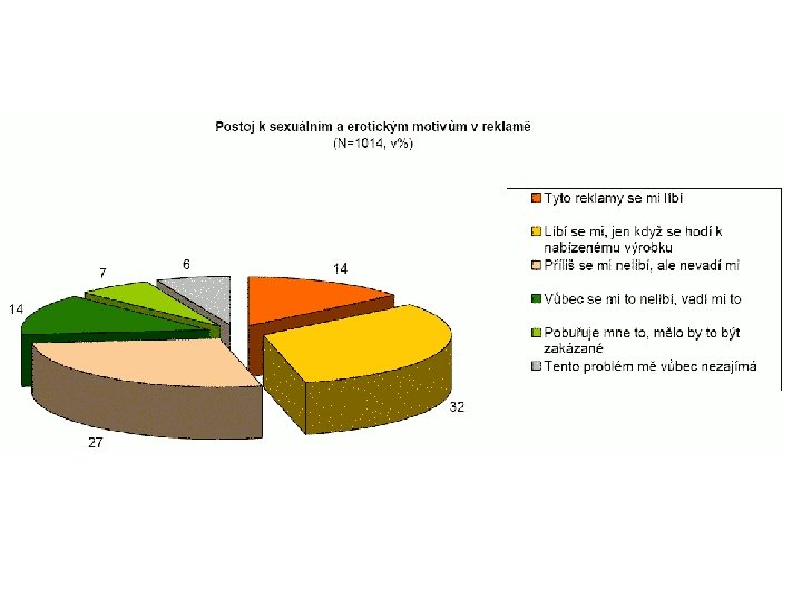 Advertising and Czech population Indifferent 50% J – people between 19 -29 L – people above 44 Education – no influence Like it 6% Don’t like it 34% Don’t like it much 10% Sample n=1095, 2003