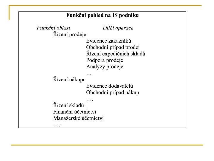 Taktické a operativní řízení podniku n n Vytváření a aktualizace rozsáhlých datových bází Realizace procesů operačního charakteru Vytváření a prezentace požadovaných přehledů, statistik Základní analýzy