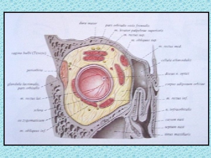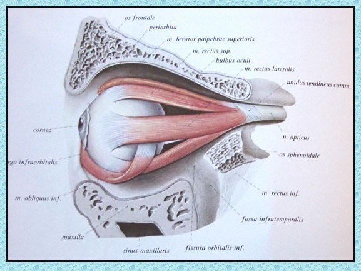 ORBİTA İÇERİSİNDEKİ YUMUŞAK DOKULAR • Bulbus okuli • Palpebralar • Rektus kasları: Medial, lateral, süperior, inferior, süp oblik inferior oblik ve levator palpebra kası • Optik sinir • oftalmik ven • Retrobulber yağ dokusu