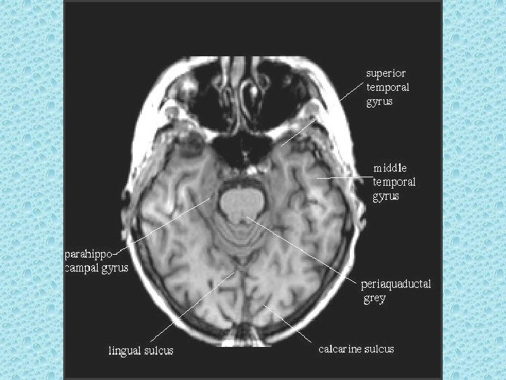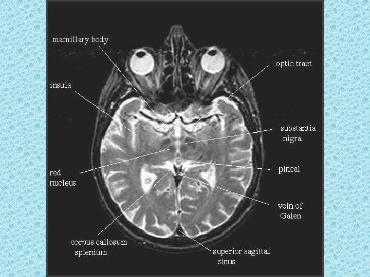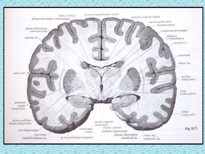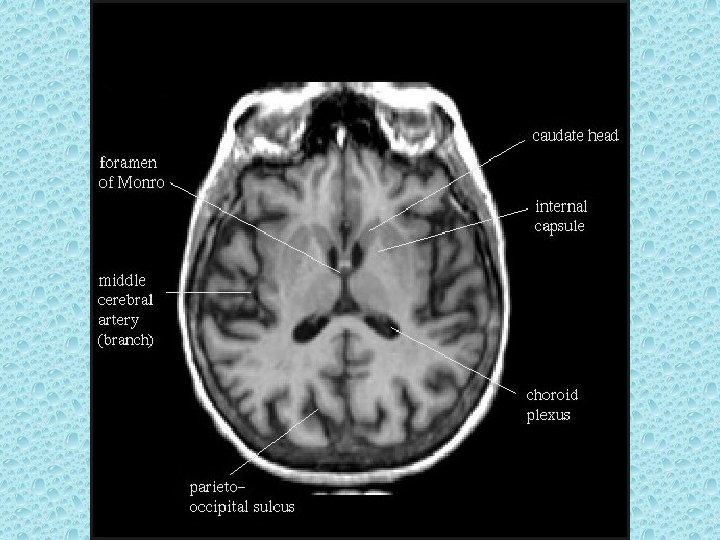 SEREBRAL PARANKİMDE BULUNAN YAPILAR • • Beyaz ve gri cevher Girus ve sulkuslar Lentiform nükleus: Putamen ve globus pallidus İnternal ve eksternal kapsül Talamus Kaudat nükleus ve korpus kallozum Ventriküller Koroid pleksus