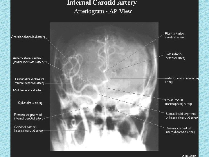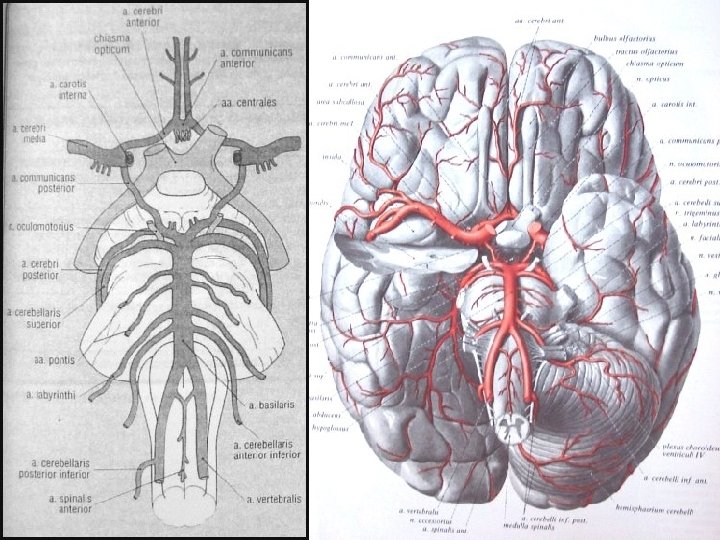 KAFA İÇİNİ BESLEYEN ARTERLER • Bilateral karotid sistem: İnternal karotid arter - A. oftalmika, a. kommunikans posterior, a. koroidea, a. serebri anterior ve media • Vertebrobaziler sistem: Vertebral arterler ve baziller arterlerden oluşur - A. Serebellaris posterior inferior (pica), anterior inferior (aica), a. serebellaris superior, a. serebri posterior