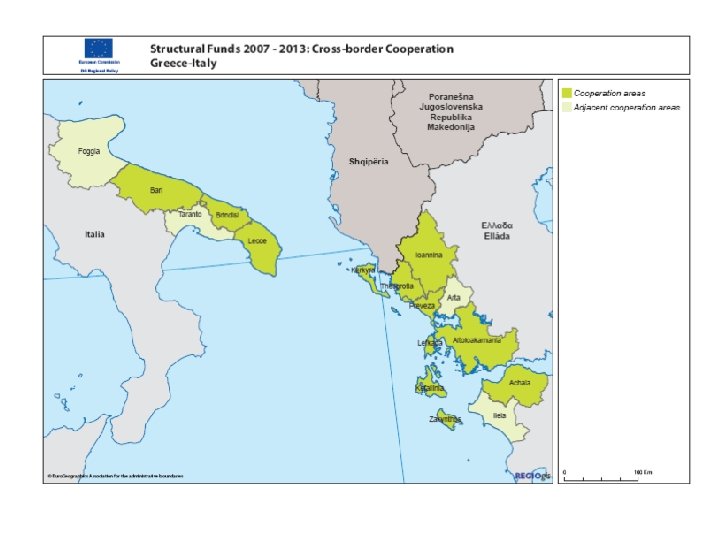 Elementi identificativi • L’area ammissibile è formata dalla Regione della Grecia Occidentale, dalla Regione delle Isole Ioniche, dalla Regione di Epiro, dalla Regione Puglia (Province di Bari, Brindisi, Lecce). Territori adiacenti ammessi sono la Prefettura di Ilia, le Province di Taranto e Foggia • Il PO (approvato il 28. 3. 08) è dotato di un bilancio complessivo di circa 118 milioni di euro. Il finanziamento comunitario per il tramite del Fondo europeo di sviluppo regionale (FESR) ammonta a circa 89 milioni di euro • L’Ad. G è il Ministero dell’Economia e delle Finanze della Repubblica di Grecia.