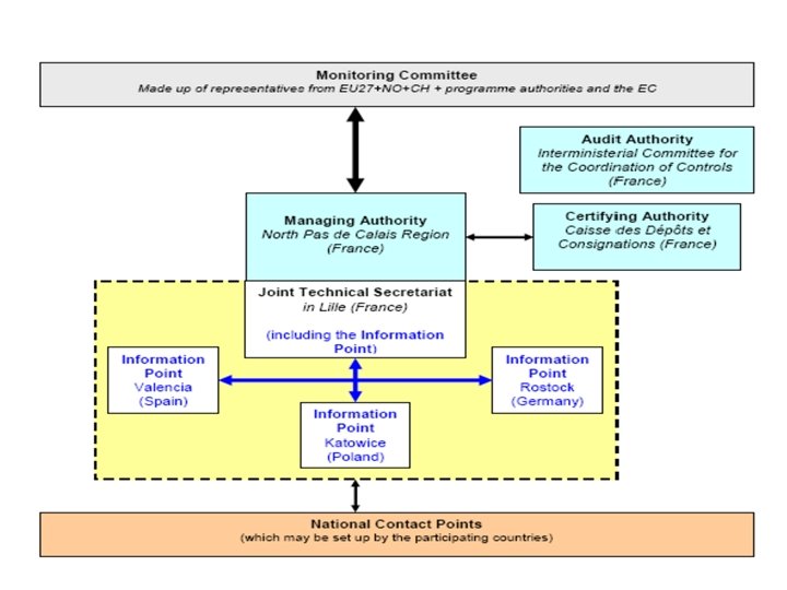 L’organizzazione italiana • Per ciascun programma di cooperazione transnazionale è stato costituito un Comitato Nazionale presieduto da una Regione che assume il ruolo di Coordinatore Nazionale. • Il Comitato è composto da rappresentanti di Amministrazioni Centrali, Amministrazioni Regionali, Rappresentanti del partenariato socioeconomico • Ogni Comitato Nazionale è Collegato al Gruppo Nazionale di Controllo Strategico (Presieduto dal DPS)
