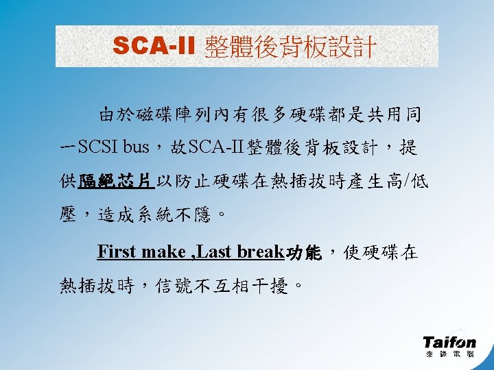 RAID Level 50 § 將資料平均分散至多組 RAID 5 硬碟上成為一個虛擬硬 碟. § 提昇硬碟I/O處理速率 § 提供硬碟容錯功能 § 需六顆以上硬碟 SCSI 1 5 P 5 13 Disk 1 2 P 3 9 14 Disk 2 P 1 6 10 P 7 Disk 3 RAID 5 Bus 3 7 P 6 15 Disk 4 4 P 4 11 16 Disk 5 RAID 0 P 2 8 12 P 8 Disk 6