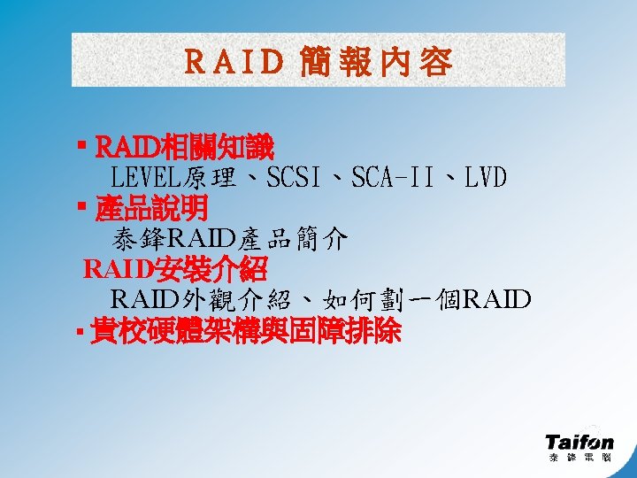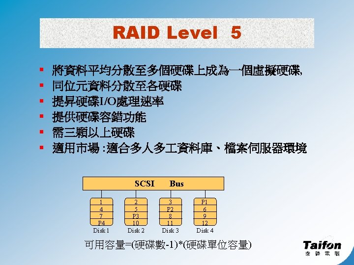 RAID 優點 § § 硬碟容錯 ( fault tolerance) 提高 I/O 處理速率 ( high performance ) 提昇硬碟總容量 ( Large Capacity ) 維護方便 ( easy maintenance )