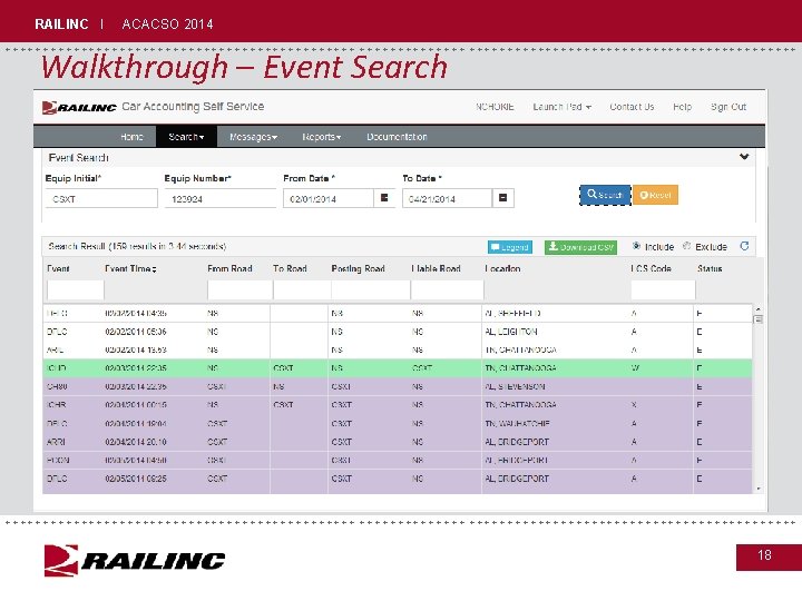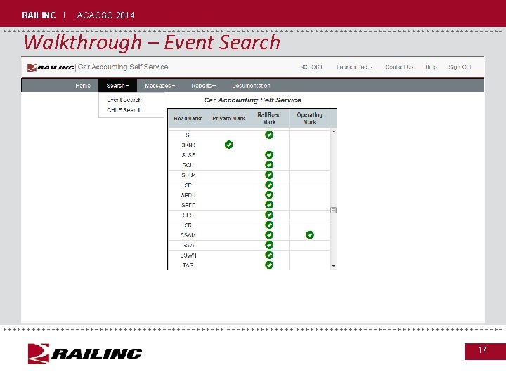 RAILINC I ACACSO 2014 +++++++++++++++++++++++++++++ Walkthrough – Event Search • The system allows for the search of movement events by: – A single rail car – Date range – up to 90 days – Events are available for two years from current date +++++++++++++++++++++++++++++ 16