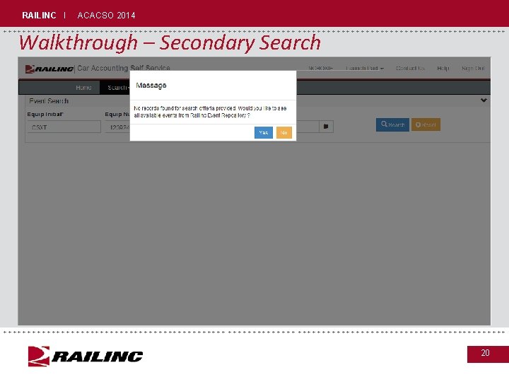 RAILINC I ACACSO 2014 Walkthrough – Event Search Detail ++++++++++++++++++++++++++++++++++++++++++++++ +++++++++++++++++++++++++++++++++++++++++++ 19