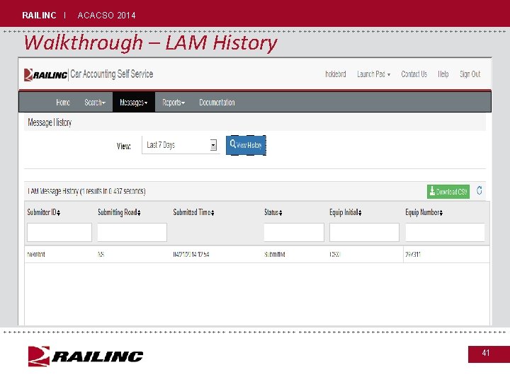 RAILINC I ACACSO 2014 +++++++++++++++++++++++++++++ Walkthrough – LAM History +++++++++++++++++++++++++++++ 40