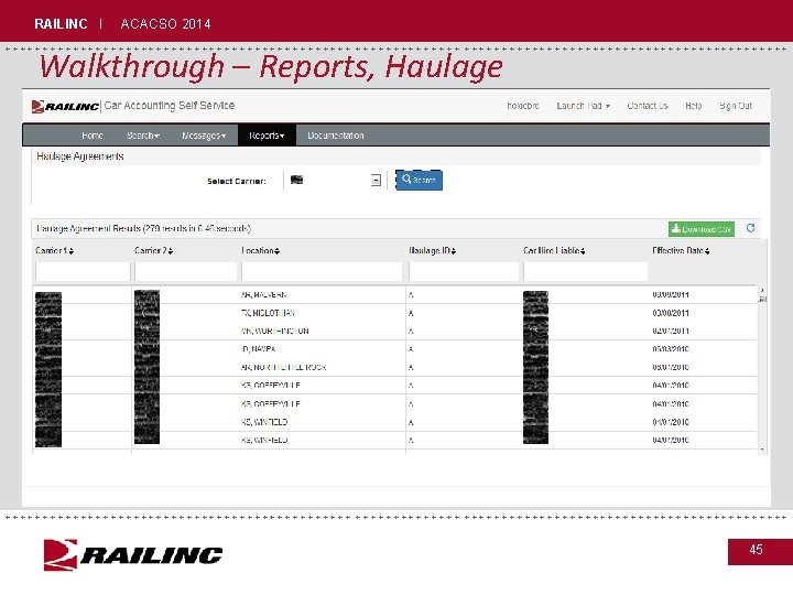 RAILINC I ACACSO 2014 +++++++++++++++++++++++++++++ Walkthrough – Reports, Haulage • Haulage agreements registered at Railinc • Haulage agreements are not directional and can be reported by either carrier • Haulage agreements are displayed when the Selected Railroad Mark is listed as – Carrier 1 – Carrier 2 – Car Hire Liable +++++++++++++++++++++++++++++ 44