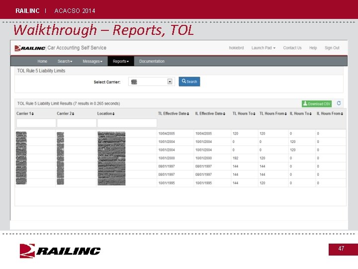 RAILINC I ACACSO 2014 +++++++++++++++++++++++++++++ Walkthrough – Reports, TOL • Gives a view into the Rule 5 TOL time limits registered at Railinc • Must be either listed as Carrier 1 or Carrier 2 • If Carrier 1 is the switch road then the To limit is used • If Carrier 2 is the switch road then the From limit is used +++++++++++++++++++++++++++++ 46
