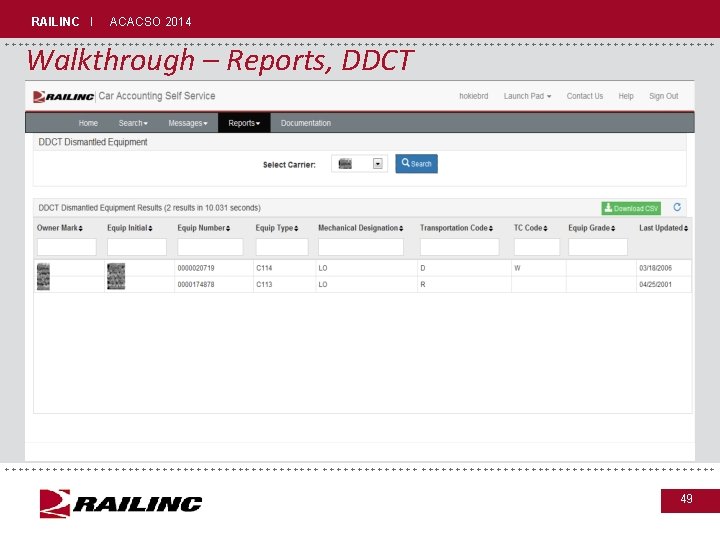 RAILINC I ACACSO 2014 +++++++++++++++++++++++++++++ Walkthrough – Reports, DDCT • Displays all cars that are in DDCT Dismantled status and are still registered in Umler • Report shows only cars that the selected Mark owns • Report may take some time to perform +++++++++++++++++++++++++++++ 48