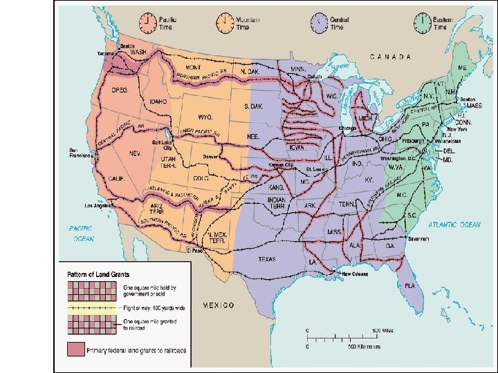 Railroads Drive the Economy Growth and Influence 35, 000 miles (1865) to 200, 000 miles (1900) First Transcontinental Railroad (1869) Leland Stanford’s Union Pacific and Central Pacific meet at Promontory Summit, UT Market connections, boomtowns, and jobs Federal Government Involvement Pacific Railway Acts Land grants and government bonds to railroad companies Requirement of standardized gauges By 1871, federal and state governments sold 300, 000 acres of land to railroads • Innovation and Improvement – – Standardized gauges Westinghouse air brakes Steel Time zones