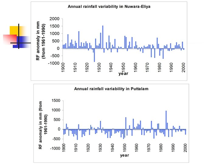 Season Coefficient of Variation of all Sri Lanka Rainfall 1931 1960 – 1961 1990 Northeast Monsoon (Dec. to Feb. ) 31% 42% First Intermonsoon (Mar. to Apr. ) 23% 27% Southwest Monsoon (May. to Sep. ) 21% 16% Second Intermonsoon (Oct. to Nov) 22% 23% Annual (Jan. to Dec. ) 12% 14% - The Coefficient of Variation of all-Sri Lanka Rainfall during the periods 1931 -1960 and 1961 -1990.