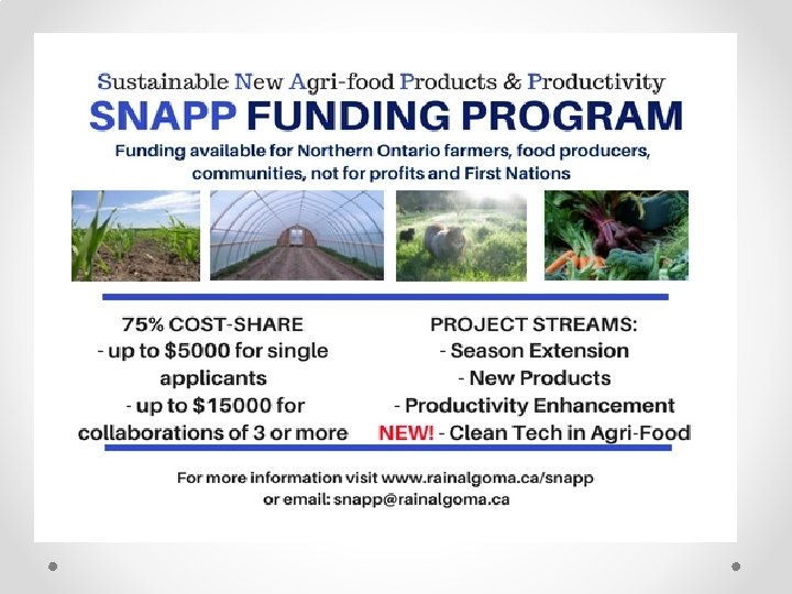 Sustainable New Agri-Food Products & Productivity (SNAPP) Program In Northern Ontario, many agriculture and food producers/businesses have difficulty funding equipment purchases for expansions such as value-added processing, season extension, productivity enhancements and clean tech projects. • Micro-grant program administered by RAIN and funded by Fed. Nor • Provides up to $5, 000 at 75% cost share to farm & food businesses in Northern Ontario • Collaborations of three or more are eligible for up to $15, 000 at 75% cost share