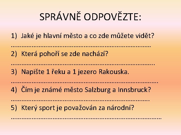 POUŽITÉ ZDROJE Vlastní zdroje http: //cs. wikipedia. org/wiki/Soubor: Grossglockner_from_SW. jpg http: //cs. wikipedia. org/wiki/Soubor: Rakouske_alpy_1. jpg http: //cs. wikipedia. org/wiki/Soubor: Tribulaune. jpg http: //cs. wikipedia. org/wiki/Soubor: Mondsee_from_above. jpg http: //cs. wikipedia. org/wiki/Soubor: Wiener_Riesenrad_DSC 02378. JPG http: //cs. wikipedia. org/wiki/Soubor: Oper_z 03. JPG http: //cs. wikipedia. org/wiki/Soubor: Nationalbibliothek 01. jpg http: //cs. wikipedia. org/wiki/Soubor: Graz_clock_tower. jpg http: //cs. wikipedia. org/wiki/Soubor: Salzburger_Stadtansicht. jpg http: //cs. wikipedia. org/wiki/Soubor: Schigebiet_Schladming. jpg http: //cs. wikipedia. org/wiki/Soubor: Dachstein_z_hochgollingu. jpg http: //cs. wikipedia. org/wiki/Soubor: Schloss_Klessheim. jpg http: //cs. wikipedia. org/wiki/Soubor: Schloss_merkenstein 01. jpg http: //cs. wikipedia. org/wiki/Soubor: Belvedere_Vienna_June_2006_009. jpg http: //cs. wikipedia. org/wiki/Soubor: Burg_Ottenstein_080523_2. jpg http: //cs. wikipedia. org/wiki/Soubor: Castle_Liechtenstein. jpg http: //cs. wikipedia. org/wiki/Soubor: Bern_luftaufnahme. png Prezentace obsahuje animace.