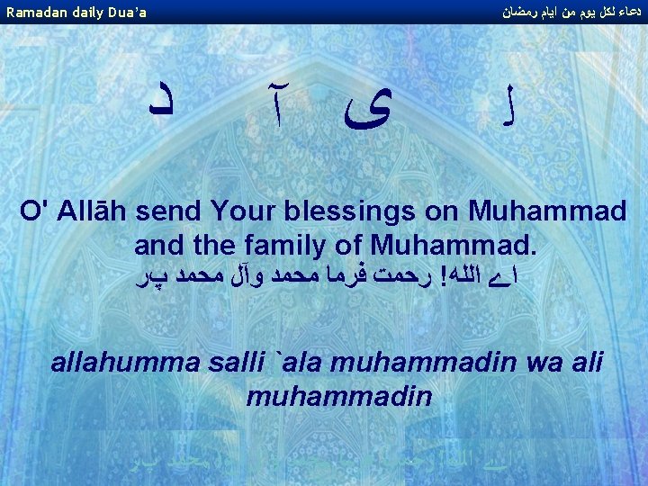 Ramadan daily Dua’a ﺩ ﺩﻋﺎﺀ ﻟﻜﻞ ﻳﻮﻡ ﻣﻦ ﺍﻳﺎﻡ ﺭﻣﻀﺎﻥ ﻯ آ ﻟ O' Allāh send Your blessings on Muhammad and the family of Muhammad. ﺍے ﺍﻟﻠﻪ! ﺭﺣﻤﺖ ﻓﺮﻣﺎ ﻣﺤﻤﺪ ﻭآﻞ ﻣﺤﻤﺪ پﺮ allahumma salli `ala muhammadin wa ali muhammadin