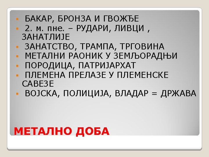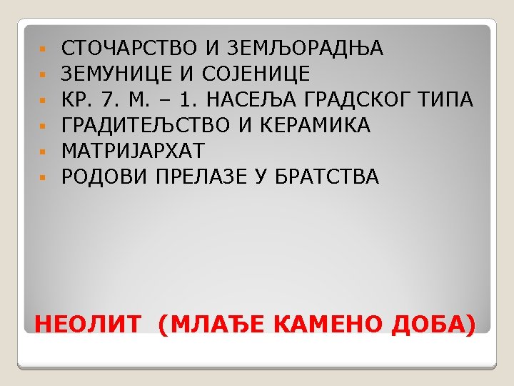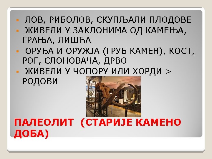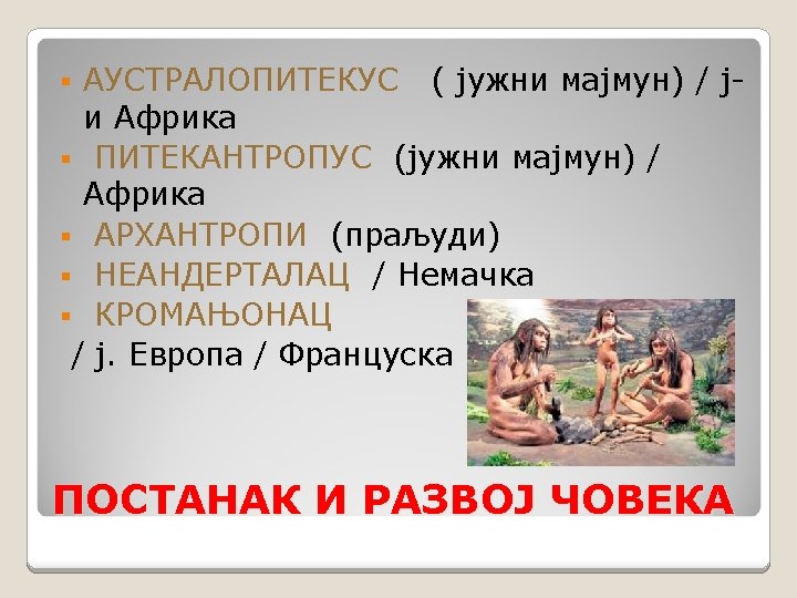 • Ramapitikus — Ostaci ove vrste na pola puta između čovekolikih majmuna i ljudi pronađeni su u Nepalu. Smatra se da potiču iz Miocena, između 12 i 8 miliona godina p. n. e. • Australopitekus — ova vrsta hominida postojala je pre 4 miliona godina. Smatra se sigurnim pretkom današnje ljudske rase. • Homo Habilis ili Vešti čovek — ovaj predak čoveka živeo je u periodu od 2, 3 do 1, 4 miliona p. n. e. Naziv je dobio po tome što se smatra da je umeo da pravi i koristi prve primitivne kamene alatke. • Homo Erektus ili Uspravni čovek — izumrla vrsta hominida koja je živela u periodu od 1, 8 miliona do 300 hiljada godina p. n. e. Tako nazvan po uspravnijem stavu na dve noge. Koristio je naprednije alatke od Veštog čoveka. • Neandertalac — nisu direktna već bočna grana razvoja savremenog čoveka, koja je ipak učestvovala u njegovom genetskog kodu mešanjem sa direktnim precima. Živeli su u pećinama tokom Ledenog doba. Neandertalci su izrađivali napredne alatke, posedovali sposobnost govora i živeli su složenim socijalnim formacijama. • Homo Sapiens ili Razumni čovek — najdirektniji preci savremenog čoveka. Bili su viši i dužih udova od neandertalaca. Pretpostavlja se da su bili i pametniji.