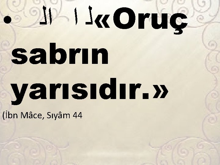 • ﺍﻟ ﺍ ﺍ ﺍ ﻱ ﺍ ﺍﻱ ﻱ ﻭ ﺍﻟ ﺍﻯ ﻳ ﺍ ﺍ ﺍ ﻱ ﺍﻟ ﺍ ﻱﺍﻱ « Oruç kötülüklere karşı kalkandır. Sizden biriniz oruçlu iken cahillik yapmasın, hanımına yaklaşmasın, biri onunla dövüşür ve ona söverse iki kez ben oruçluyum desin. Nefsimi yed-i kudretinde bulundurana yemin ederim ki oruçlunun ağız kokusu Allah’ın indinde misk kokusundan daha hayırlıdır. O benim için yemeği, içmeği ve şehvetini terk ediyor. Oruç benim içindir ve onu ancak ben mükafatlandırırım. » (Buhari savm 2)