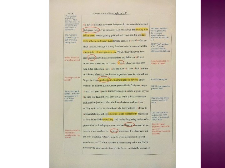 � Sentences-Discover the key sentences. Read the first and last sentence of the passage, skim the middle, and then read the whole thing. � Speaker-Discover the speaker. Look for the number of speakers and the narrator’s point of view. Note anything that gives a clue about the speaker’s tone. � Situation-Discover the situation. What is happening? State the situation in one clear sentence. � Shifts-Discover the shifts. Find the big changes in the way the sentences are put together, the way the words are used, and the way the writer changes what he or she is saying. Find areas of the passage where you can locate the most changes, and closely annotate them. You need to look for changes in (syntax, diction, connotation, denotation, tone, sentence length, rhythm, punctuation, or patterns of imagery).