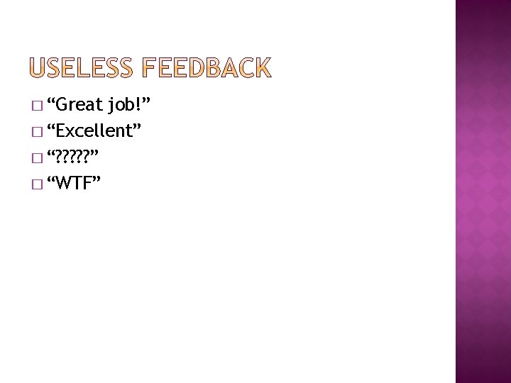 “I loved the way you used anaphora to drive home your point. It was very effective. ” � “You did a great job elaborating on your quotes. Your insight was clear and thorough. ” � “Your topic focused on beliefs. How did you end up talking about your sister setting your hair on fire? You need to stick to your topic. Try using an outline or brainstorm for clarity. ” � “Your narrative lacks strong verbs. Go back and identify 5 dead/weak verbs and revise your word choice. ” �