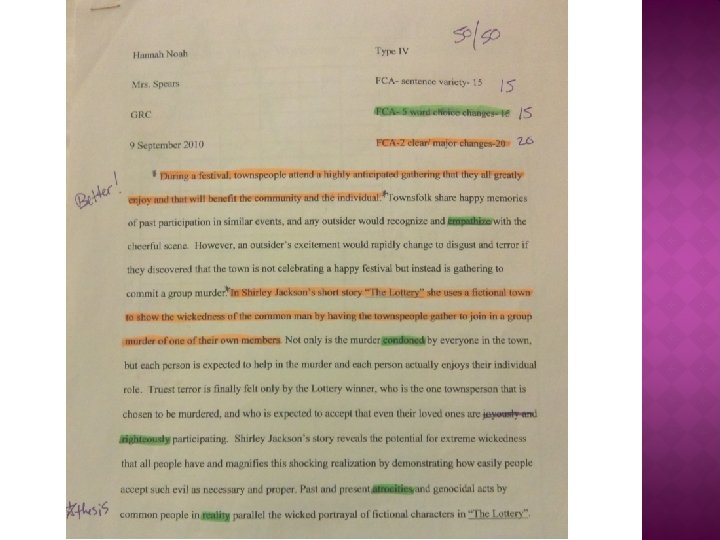 � Embraces the revision process �So many times we rush through & fail to truly “teach the revision process” or model it! �The beauty of writing is in the revision process, that’s when we are really learning! � If we grade everything the sea of red/green is overwhelming! �Research proves that students learn and improve by focusing on specific “small” areas of difficulty � FCA’s – Focus Correction Areas – allow for objective grading.