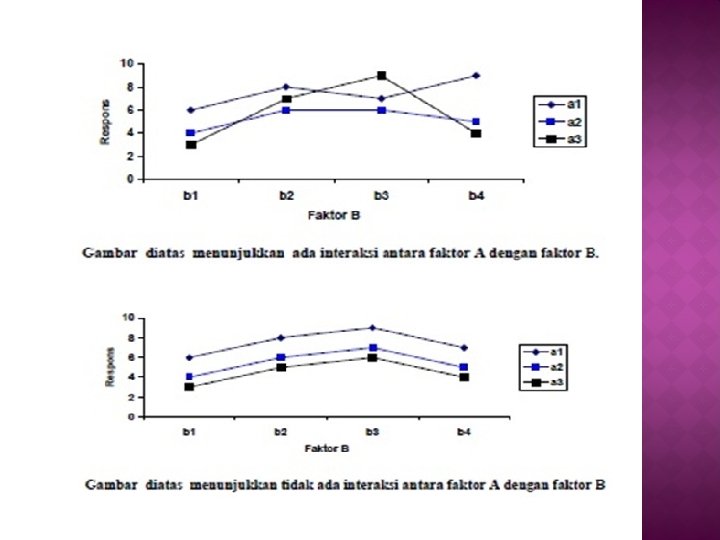Untuk Faktor B : • Jika FHitung < FTabel (0, 05), maka H 0 diterima, hal ini berarti faktor B tidak berpengaruh nyata. • Jika FHitung ≥ FTabel (0, 05), maka H 0 ditolak, hal ini berarti faktor B berpengaruh nyata. • Jika FHitung ≥ FTabel (0, 01), maka H 0 ditolak, hal ini berarti faktor B berpengaruh sangat nyata. Untuk Interaksi Kedua Faktor : • Jika FHitung < FTabel (0, 05), maka H 0 diterima, hal ini berarti interaksi kedua faktor tidak berpengaruh nyata. • Jika FHitung ≥ FTabel (0, 05), maka H 0 ditolak, hal ini berarti interaksi kedua faktor berpengaruh nyata. • Jika FHitung ≥ FTabel (0, 01), maka H 0 ditolak, hal ini berarti interaksi kedua faktor berpengaruh sangat nyata.