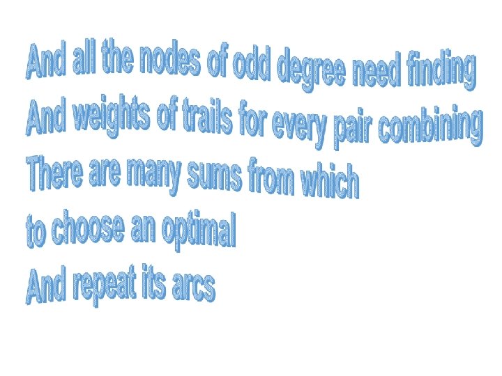And all the nodes of odd degree need finding And weights of trails for every pair combining There are many sums from which to choose an optimal And repeat its arcs
