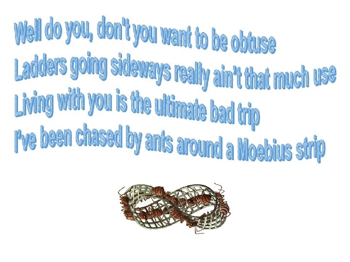 At his age his hearing falters, His eyes have gone as well But that won’t even stop him, He writes by sense of smell Always knows theorems, I’ve never seen him floored That crazy maths professor Sure plays a mean black board