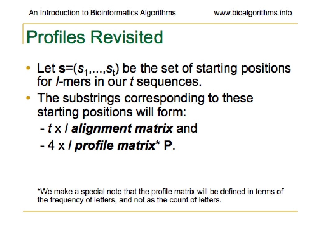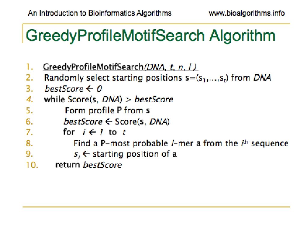 Problems With Greedy. Profile. Motif. Searc h • Very little chance of guess being optimal • Unlikely to lead to correct solution at all • Generally run many times • Basically, hoping to stumble on the right solution (optimal motif)