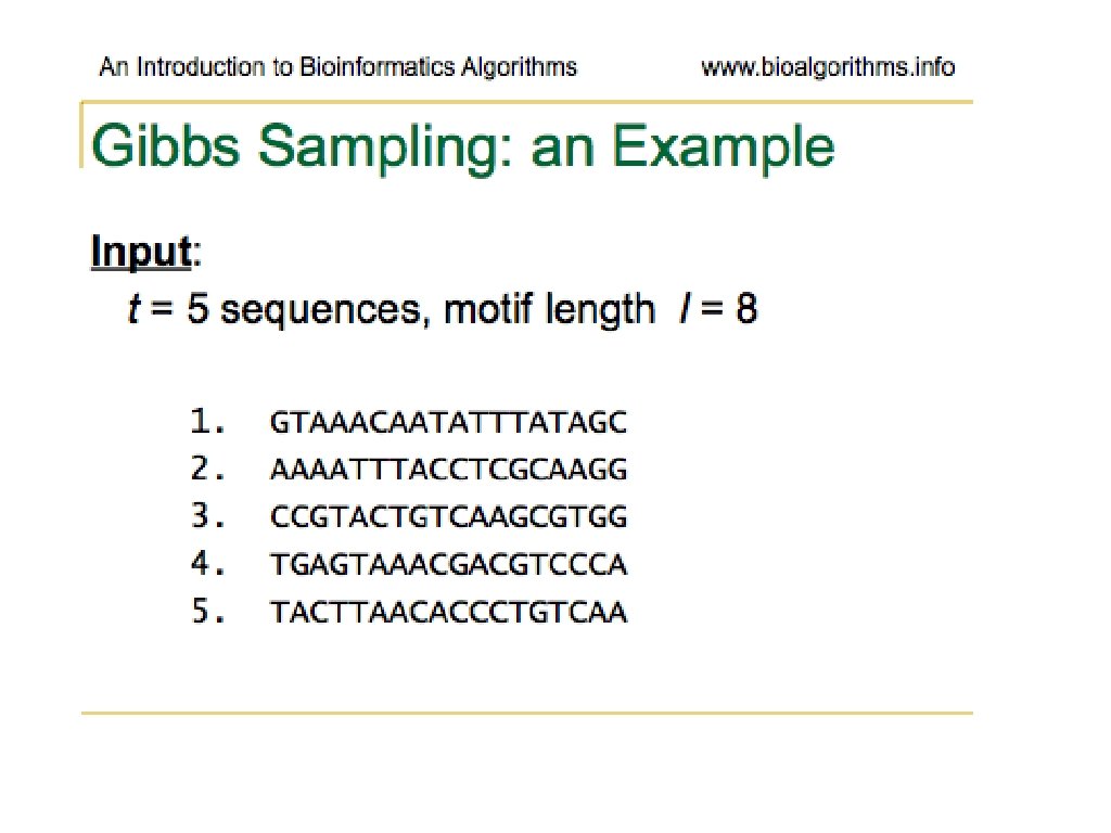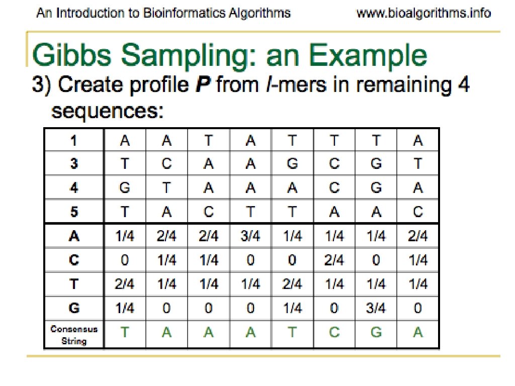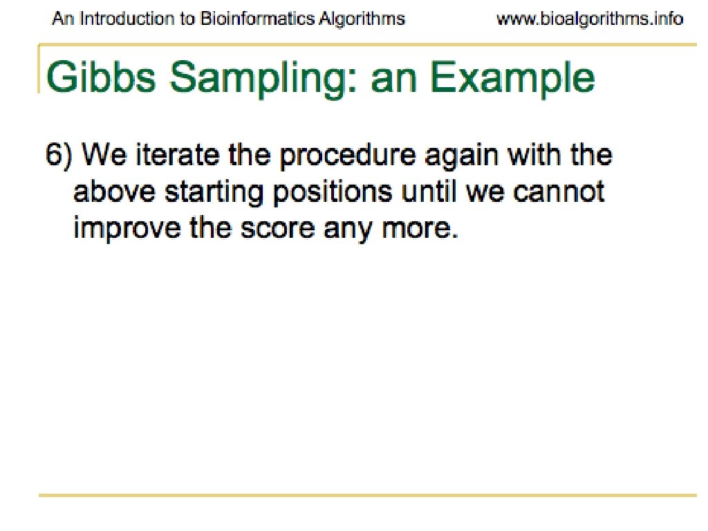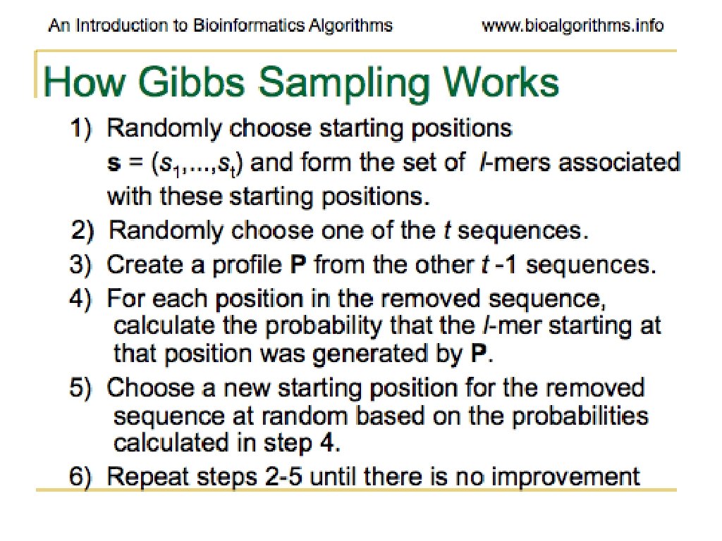 Problems with Gibbs Sampling • Needs to be modified if applied to samples with uneven nucleotide distribution • Way more of one than others can lead to identifying group of like nucleotides rather than the biologically significant sequence