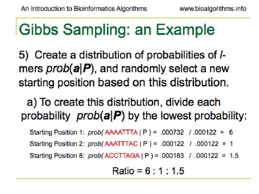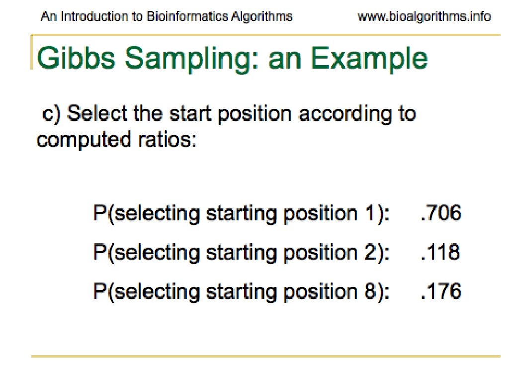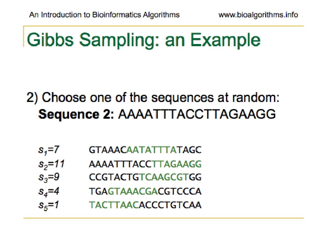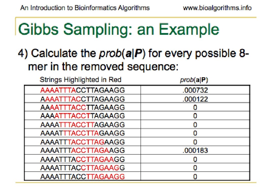 Problems with Gibbs Sampling • Needs to be modified if applied to samples with uneven nucleotide distribution • Way more of one than others can lead to identifying group of like nucleotides rather than the biologically significant sequence